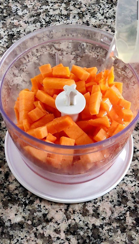 Limpia la calabaza y córtala en pequeños cubitos. Transfiere la calabaza a una batidora o licuadora y añade el aceite de semillas. Tritura para obtener una suave crema naranja.