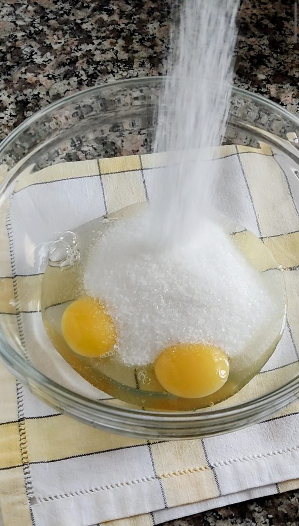 Monta los 2 huevos con el azúcar con la ayuda de una batidora eléctrica durante 4-5 minutos hasta obtener una mezcla clara y espumosa.