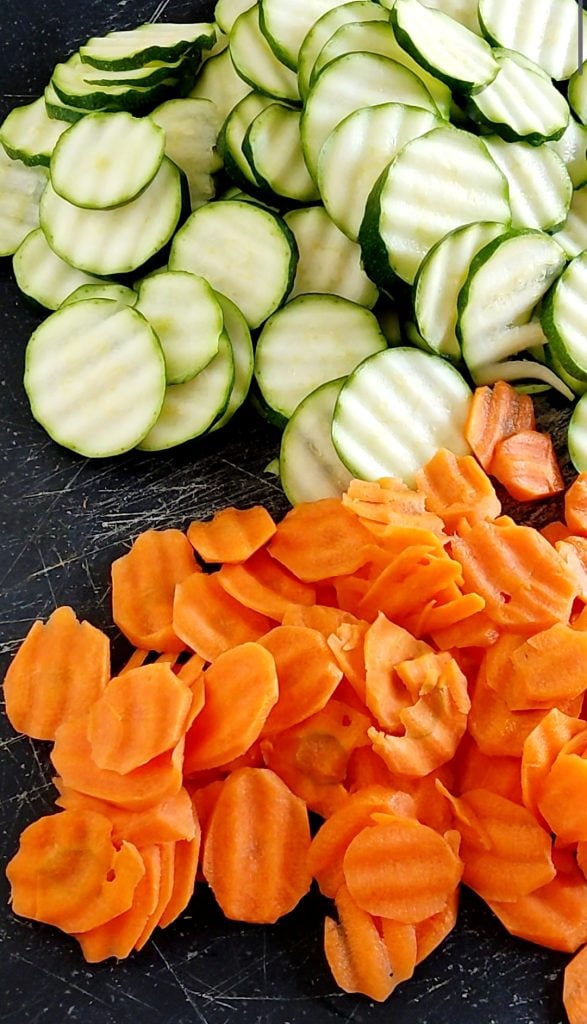 • Corta los calabacines y las zanahorias en rodajas finas. Yo utilicé un corta verduras de ondas para un efecto escénico que me gustó, pero va perfectamente un cuchillo clásico o una mandolina para obtener rodajas todas iguales.