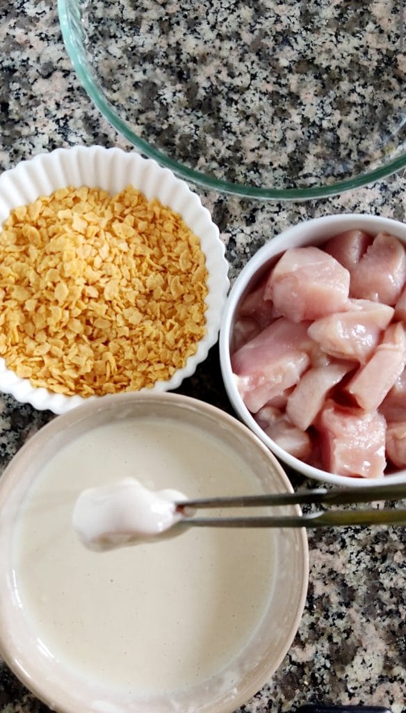 • Coloca los cornflakes en una bolsa para alimentos y simplemente aplastándolos con las manos, redúcelos a pedazos más pequeños. Con la ayuda de unas pinzas de cocina, sumerge los nuggets de pollo primero en la masa y luego en un bol con los cornflakes.