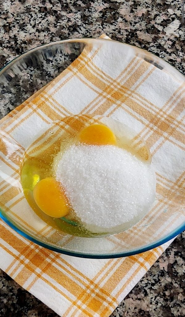 Batir los huevos con el azúcar usando una batidora eléctrica durante 7-8 minutos hasta obtener una mezcla clara y espumosa.