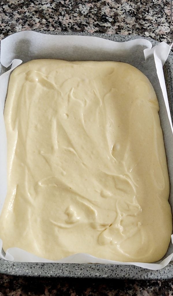 Verter la masa en un molde rectangular, el mío mide 22 x 28 cm, engrasado o forrado con papel de horno. Nivelar bien con una espátula.