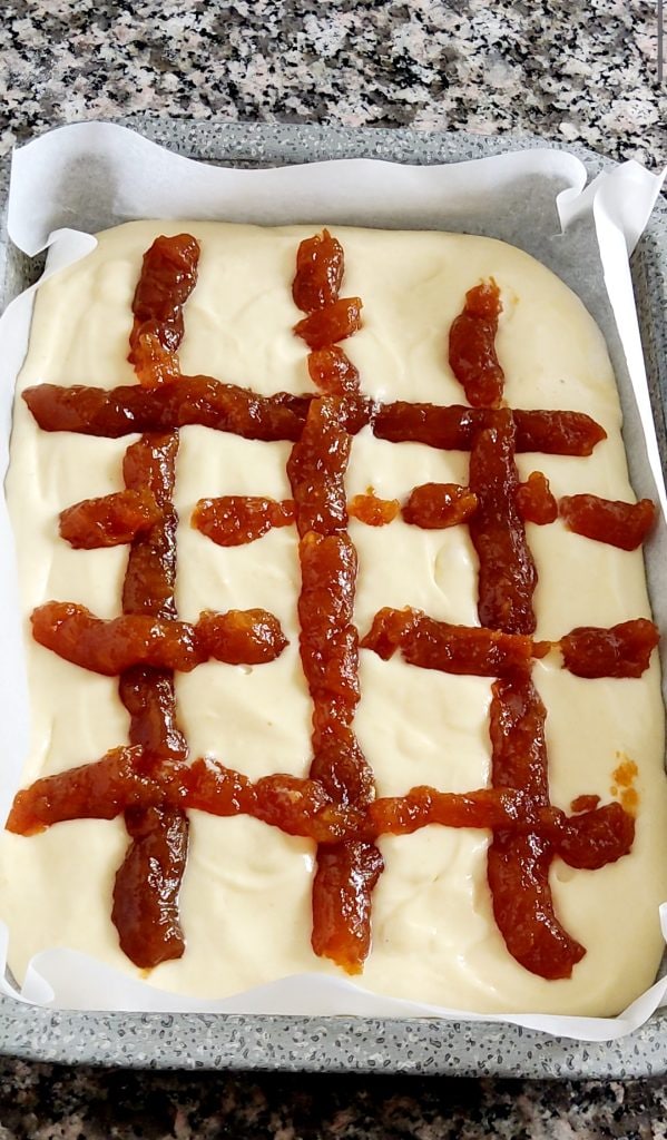 Transferir la mermelada de albaricoque a una manga pastelera con boquilla ancha y lisa. Distribuir la mermelada sobre la masa haciendo líneas verticales y horizontales como dibujando una rejilla.