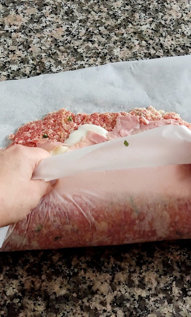 • Ayudándote con el papel de horno, enrolla la carne formando un rollo relleno. Aprieta bien los lados y las puntas para cerrarlo bien. Transfiere el pastel a una bandeja directamente con el papel de horno.