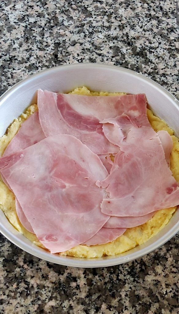 Cubre con lonchas de jamón cocido y lonchas de scamorza u otro queso blando que se derrita.