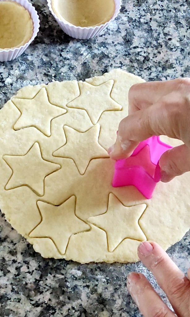 Divide el relleno en los moldes. Con los recortes de masa quebrada, extiéndela y obtén estrellas. Coloca cada estrella sobre el relleno.