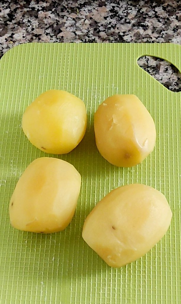 Escoged patatas más o menos del mismo tamaño para tener una cocción uniforme. Lavad las patatas y dejadlas cocinar en agua durante 25-30 minutos. Comprobad la cocción pinchándolas con las púas de un tenedor. Escurridlas y peladlas.