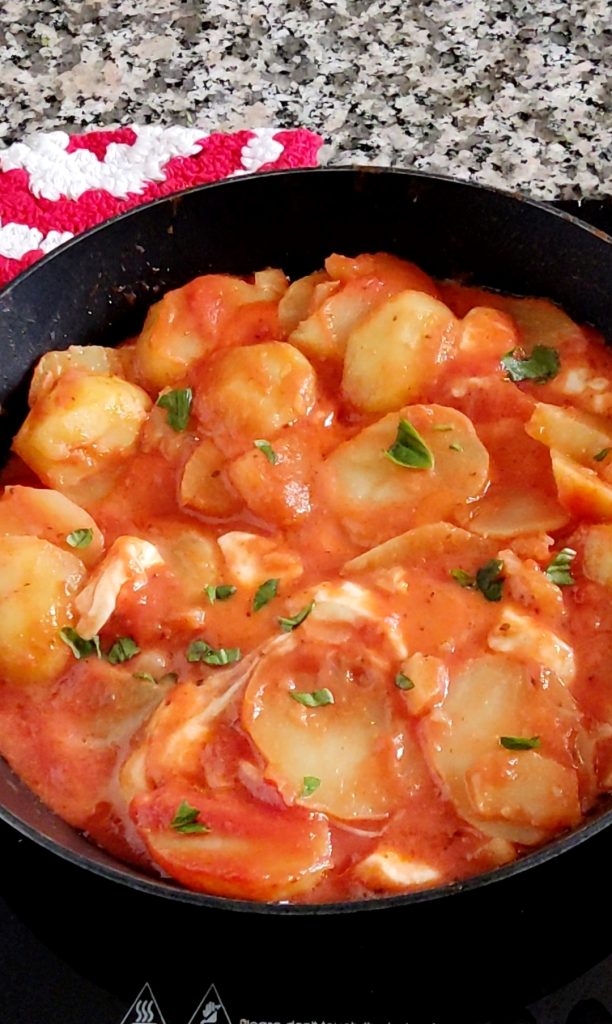 Patatas a la pizzaiola con mozzarella fundente las más ricas que habéis probado. Las patatas en mi casa nunca faltan, incluso las compro en sacos para no quedarme sin ellas. Son tan versátiles que se prestan a la preparación de mil y más recetas siempre diferentes y siempre buenísimas. La receta que quiero contaros hoy es la de buenísimas Patatas con tomate y mucha mozzarella fundente. Sabrosas y exquisitas pero también sencillas de preparar, perfectas cuando queréis conquistar a vuestra familia con una comidita especial. Os aconsejo que no os perdáis tampoco la receta de los Cazzilli de patatas y la receta de las Croquetas de patatas al horno. Pocos y simples ingredientes y preparad el pan para mojar en la salsita. Vamos entonces a la cocina y preparemos las Patatas con tomate y mozzarella