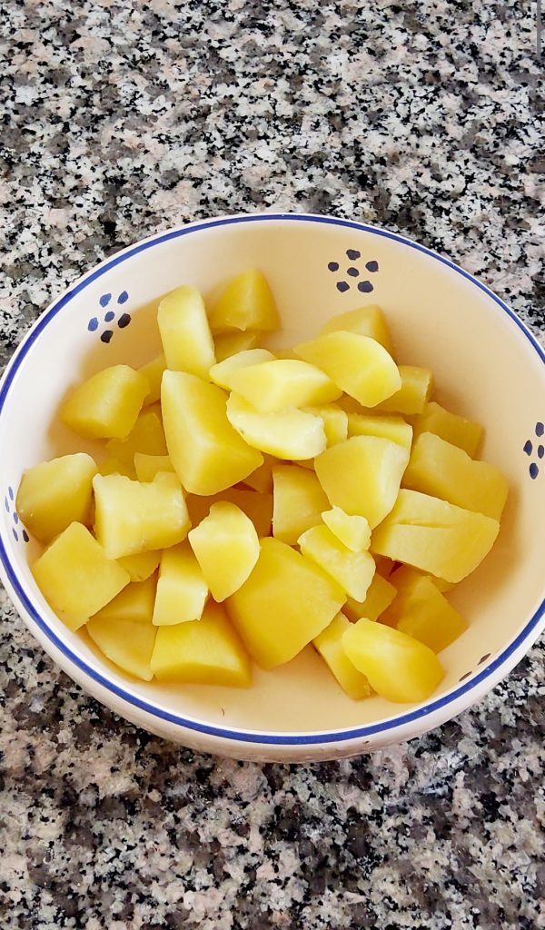 Pela las patatas. Lávalas y córtalas en cubos. Cocina las patatas en agua hirviendo durante 20-25 minutos. Prueba la cocción pinchándolas con un tenedor.