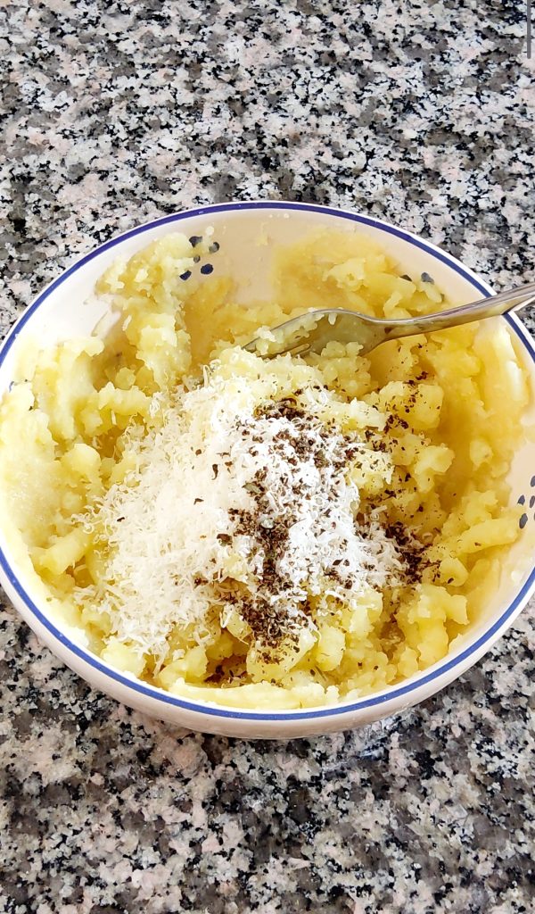 Escurre las patatas y redúcelas a puré con la ayuda de un prensador de patatas.