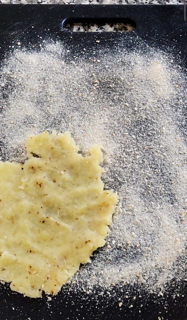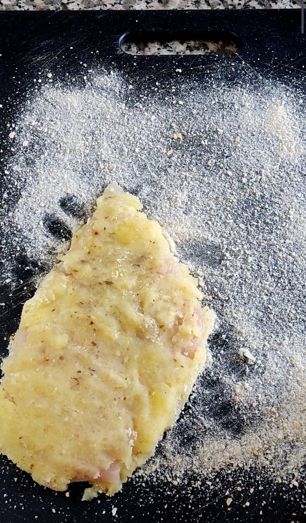 Espolvorea la superficie de trabajo con pan rallado. Aplasta encima un montón de mezcla de patatas. Coloca encima un filete delgado de pechuga de pollo.