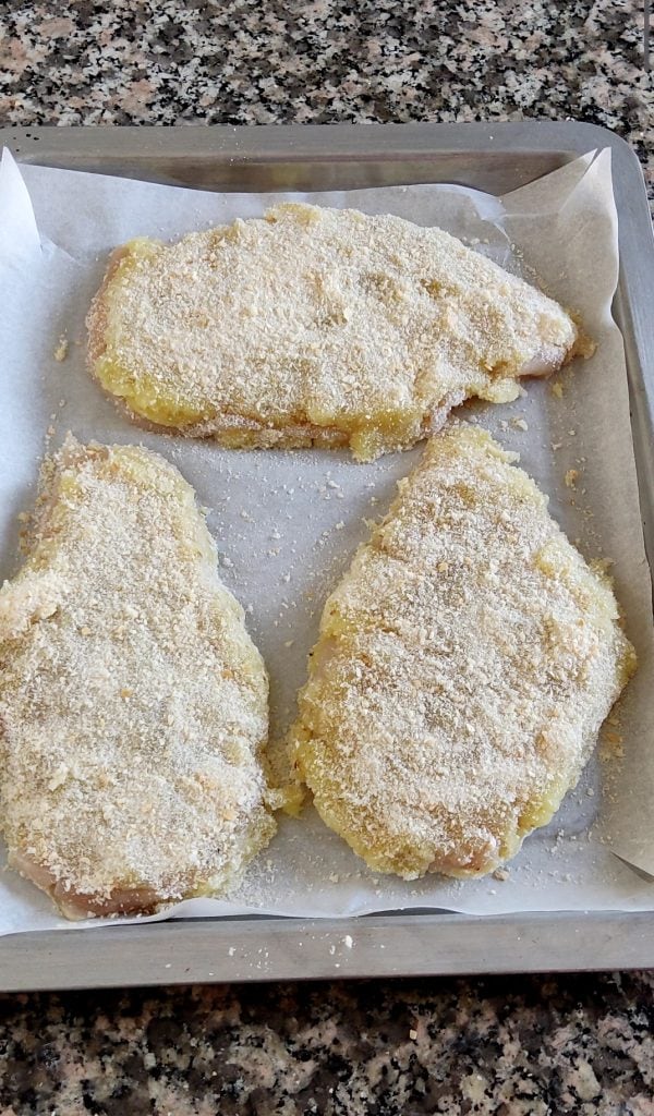 Prepara todas las Chuletas de pollo de la misma manera y colócalas en una bandeja forrada con papel de horno. Úntalas con aceite por encima.