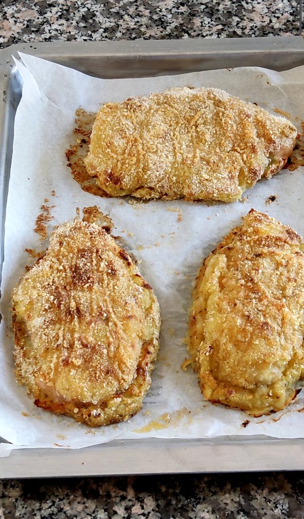 Cubre con más mezcla de patatas. Aplasta para cubrir el filete de pollo. Espolvorea la superficie con pan rallado.