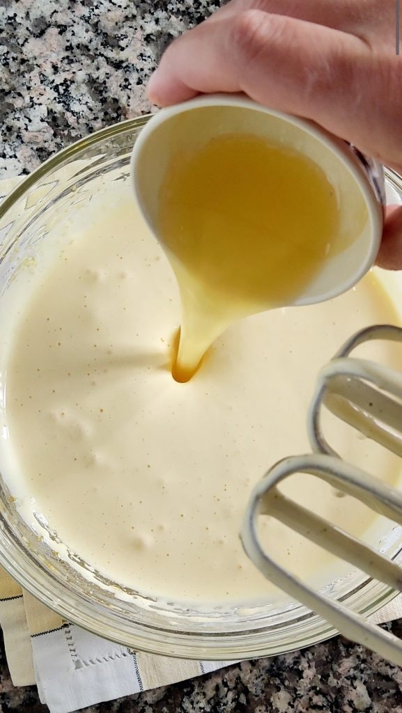 Bate los 2 huevos enteros con el azúcar con la ayuda de una batidora eléctrica durante 7-8 minutos, hasta obtener una mezcla clara y espumosa. Añade la mantequilla derretida, el café de la moka y el café soluble. Mezcla.