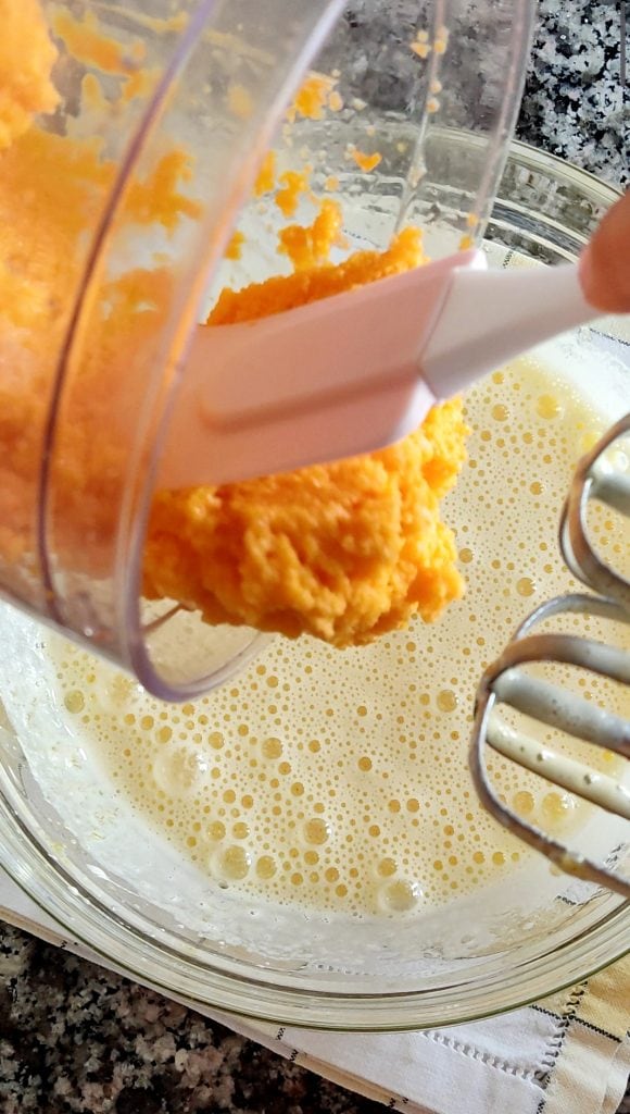 Monta los 2 huevos enteros con el azúcar con la ayuda de una batidora eléctrica durante unos 8-10 minutos, hasta tener una mezcla clara y espumosa. Incorpora la crema de zanahorias y mezcla.