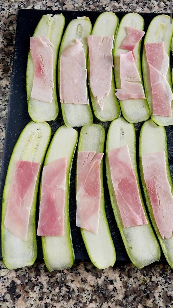 Coloca en cada rodaja de calabacín una loncha de jamón cocido y una loncha de queso
