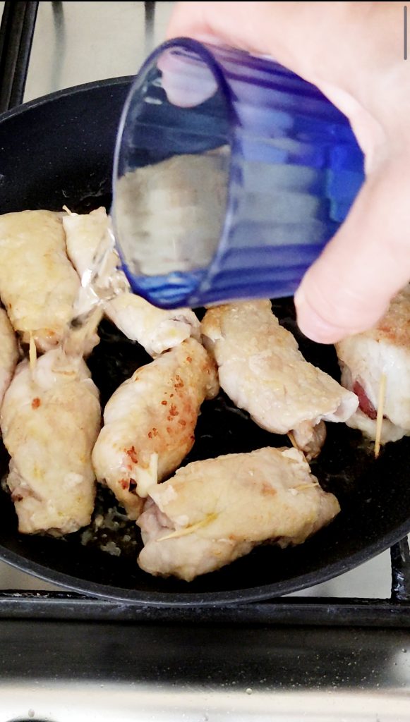Dejen dorar la carne por todas las partes a fuego medio girándola. Desglacen con el vino blanco y déjenlo evaporar a fuego bajo. Dejen cocer la carne aún por 5-6 minutos.