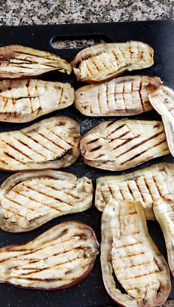 Lavad las berenjenas, eliminad el tallo y la base y sin pelarlas cortadlas en rodajas finas a lo largo. Asad las rodajas de berenjenas en una parrilla caliente. Lavad los tomates y cortadlos en trozos pequeños.
