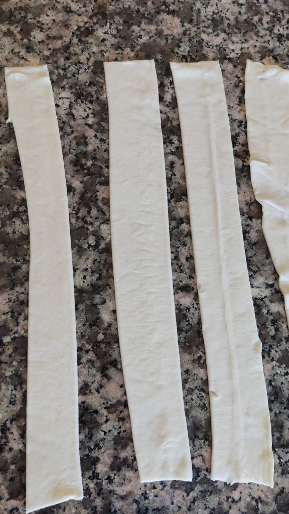 Preparad la Crema pastelera siguiendo mi receta que encontráis AQUÍ. Lavad los melocotones y cortadlos en rodajas finas. Extendede el rollo de hojaldre rectangular sobre la mesa de trabajo y cortadlo en muchas tiras.