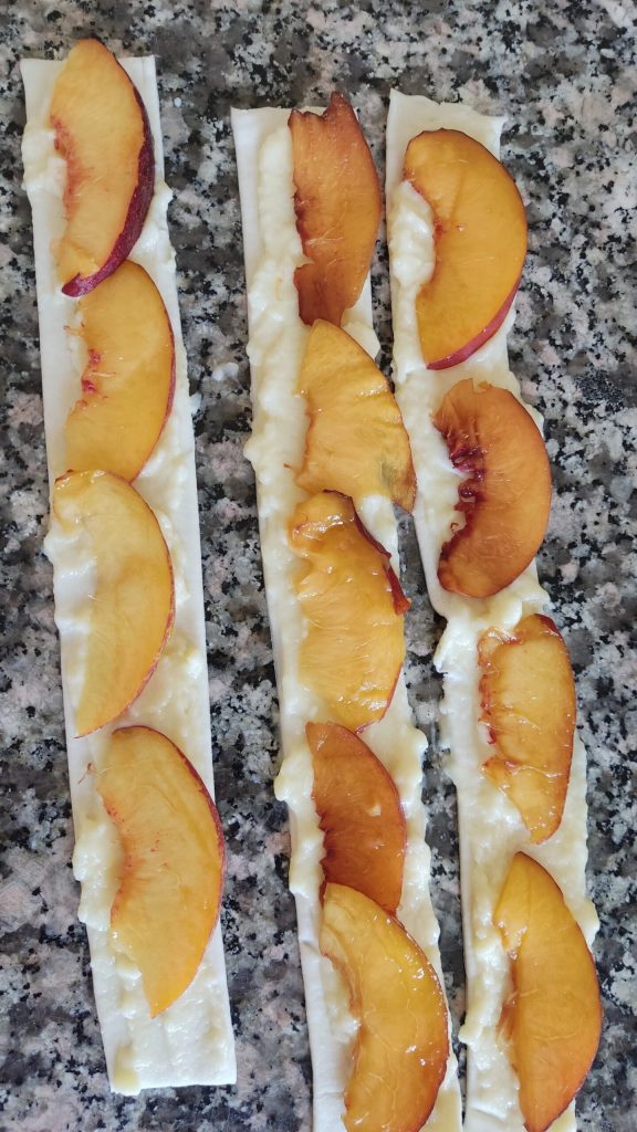Mis tiras son de unos 3 cm de ancho. Untad cada rectángulo de hojaldre con la crema y colocad encima 4-5 rodajas de melocotones
