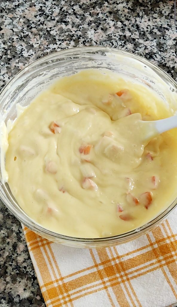 Añadir la harina tamizada y la levadura para dulces y mezclar bien. Finalmente, añadir los albaricoques en trozos y mezclar con una espátula para incorporarlos a la masa.