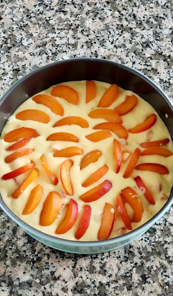Verter la masa en un molde de 20 cm de diámetro, mejor si es desmontable, engrasado o forrado con papel de horno. Nivelar la masa. Colocar en la superficie los albaricoques en rodajas dejándolos hundirse ligeramente en la masa. Ahora, con la ayuda de 2 cucharitas, colocar en la superficie muchos pequeños montoncitos de mermelada de albaricoques.