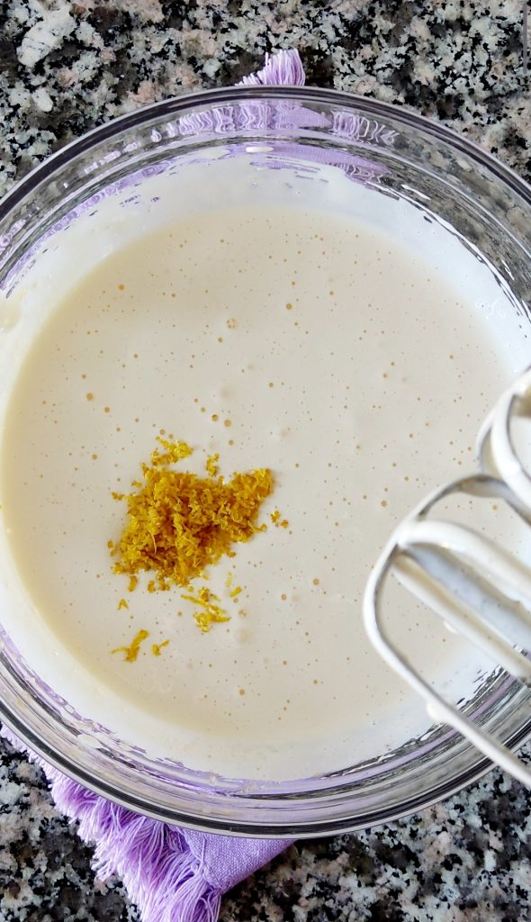 Añade la cáscara rallada de medio limón no tratado, la mantequilla derretida y un tarro de yogur blanco o de arándanos. Mezcla.