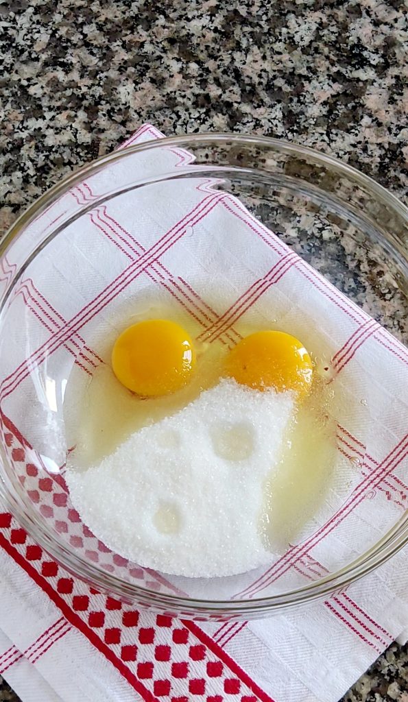 • Montad los 2 huevos enteros con el azúcar con la ayuda de una batidora eléctrica durante 6-7 minutos hasta tener una mezcla clara y espumosa. Añadid la nata y mezclad.