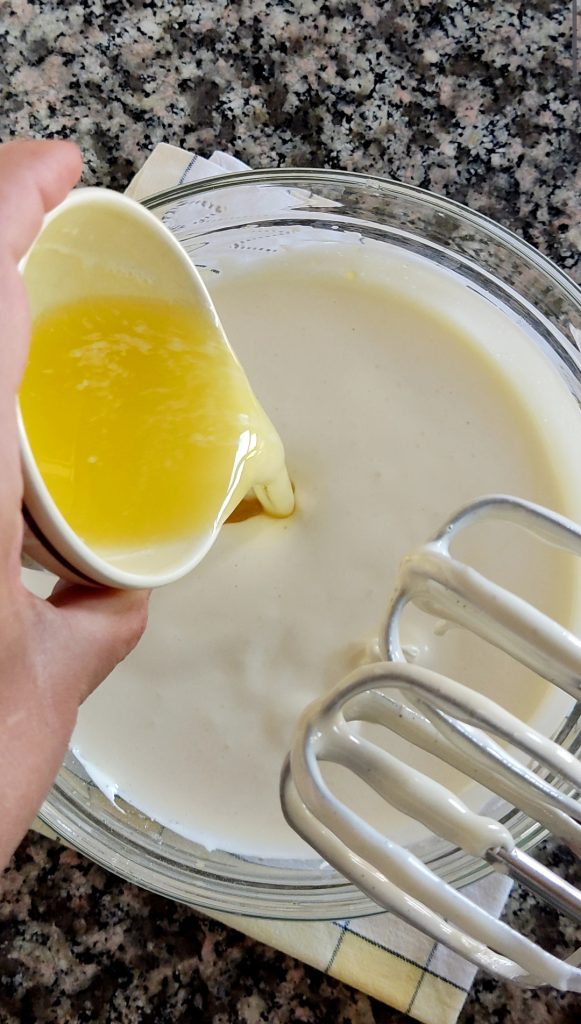 Añade a los huevos montados la mantequilla derretida y la leche y mezcla. Continúa la preparación añadiendo la harina tamizada y la levadura en polvo. Mezcla.