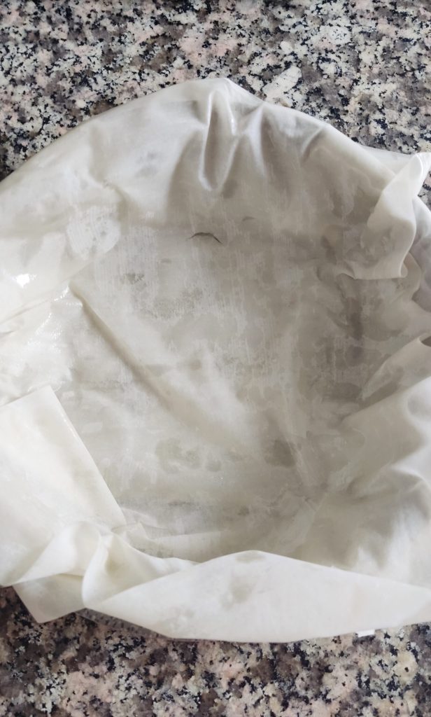 Derritid la mantequilla en el microondas o en un cazo. Engrasad un molde de tarta de 22 cm de diámetro. Forrad el molde con 4 hojas de pasta filo superponiéndolas entre ellas y pincelándolas primero con la mantequilla derretida. Pincelad las hojas de pasta filo con la mantequilla. Enrolladlas y colocadlas en espiral desde el centro del molde y poco a poco hacia el exterior para cubrir todo el fondo.