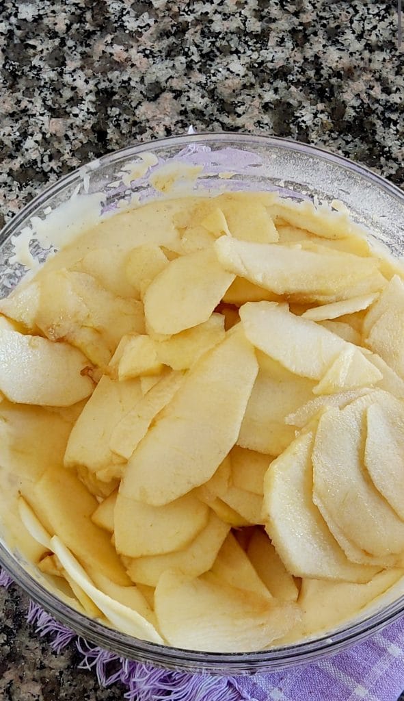 Finalmente agregue las rodajas de manzana y mezcle con una espátula para incorporarlas a la masa.