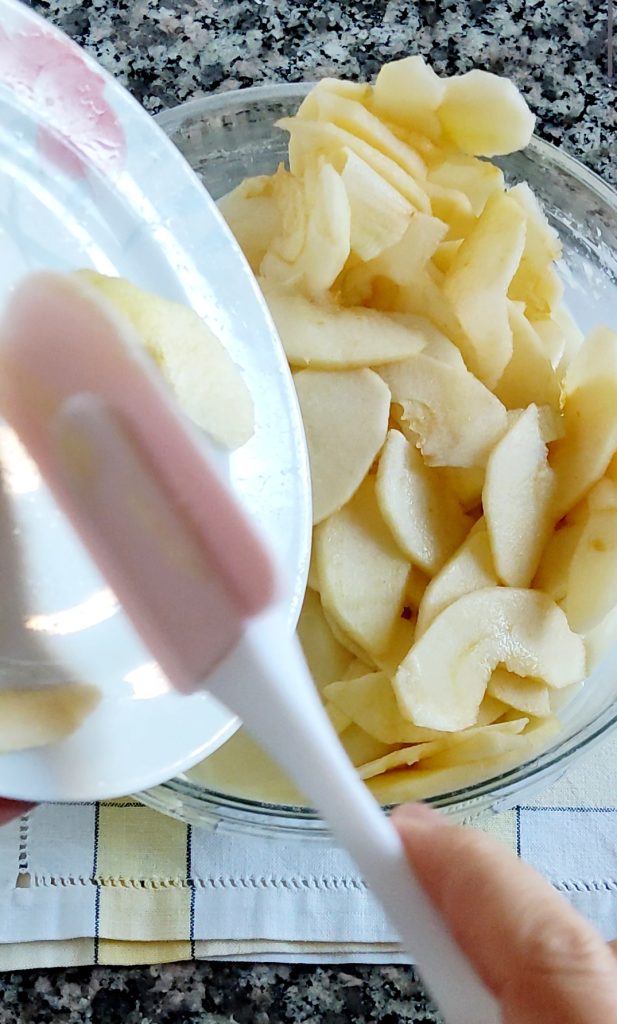 Verter la masa en un molde de 20 cm de diámetro engrasado o forrado con papel de horno. Colocar en la superficie las rodajas de manzana en círculos concéntricos dejándolas hundirse ligeramente en la masa.