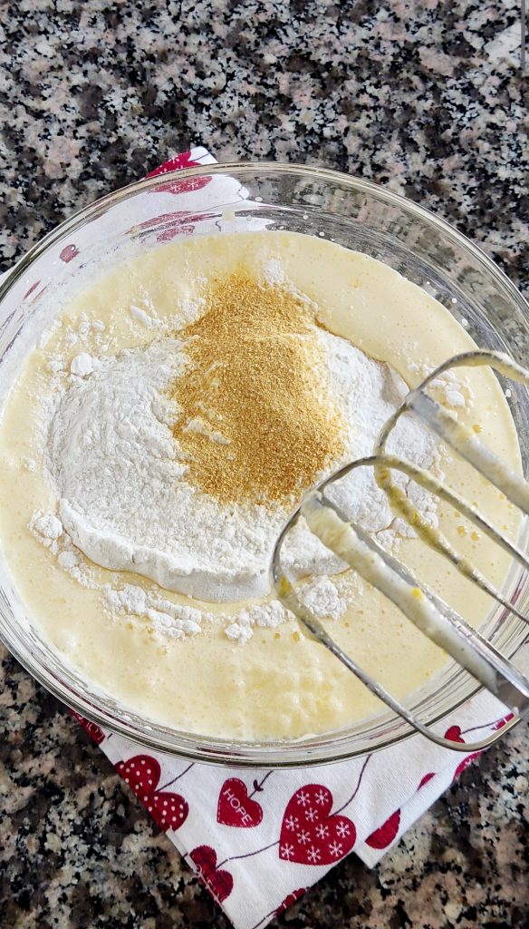 • Ahora, añadan la harina tamizada, la levadura en polvo y la cáscara rallada de la naranja. Mezclen