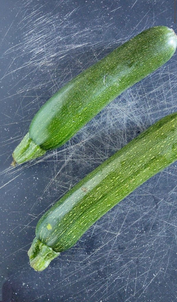 Laváis los calabacines. Cortadlos en los extremos y cortadlos en cubitos pequeños. Verted el aceite de oliva virgen extra en una sartén, añadid un diente de ajo y los calabacines.