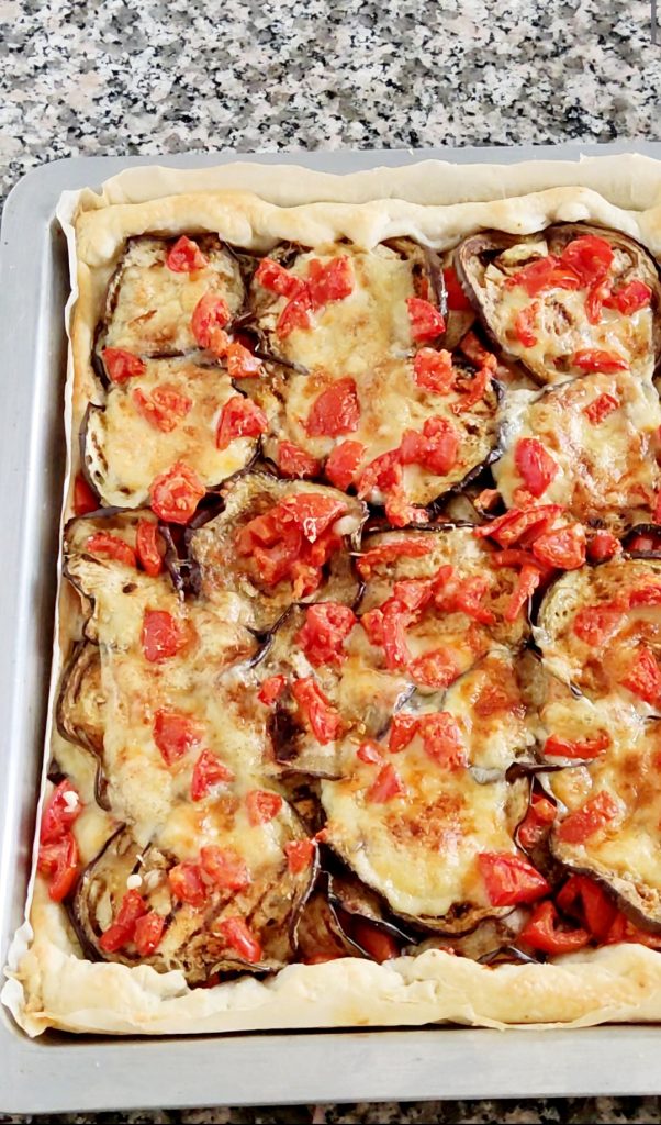 Tarta salada con berenjenas, tomatitos y queso sabrosa y deliciosa. Qué ricas son las Tartas saladas, tan versátiles y tan sencillas de preparar. Cuando no sabemos qué preparar para cenar, tenemos invitados inesperados o simplemente queremos un aperitivo, las tartas saladas siempre nos ayudan. Pocos y simples ingredientes siempre diferentes y cada vez podéis preparar una tarta salada diferente. La receta que quiero contaros hoy es la de la Tarta salada con berenjenas y tomatitos sencillísima de preparar y muy, muy rica. Un rollo de masa de hojaldre, esta vez rectangular, rodajas de berenjenas a la parrilla, tomatitos y un queso blando de vuestra elección. Yo he usado queso emmental que tenía en la nevera en rodajas finas, pero podéis elegir el que prefiráis. Os recomiendo no perderos también la receta de las Berenjenas a la parrilla y marinadas. Entonces, corramos a la cocina y preparemos juntos la Tarta salada con berenjenas a la parmigiana