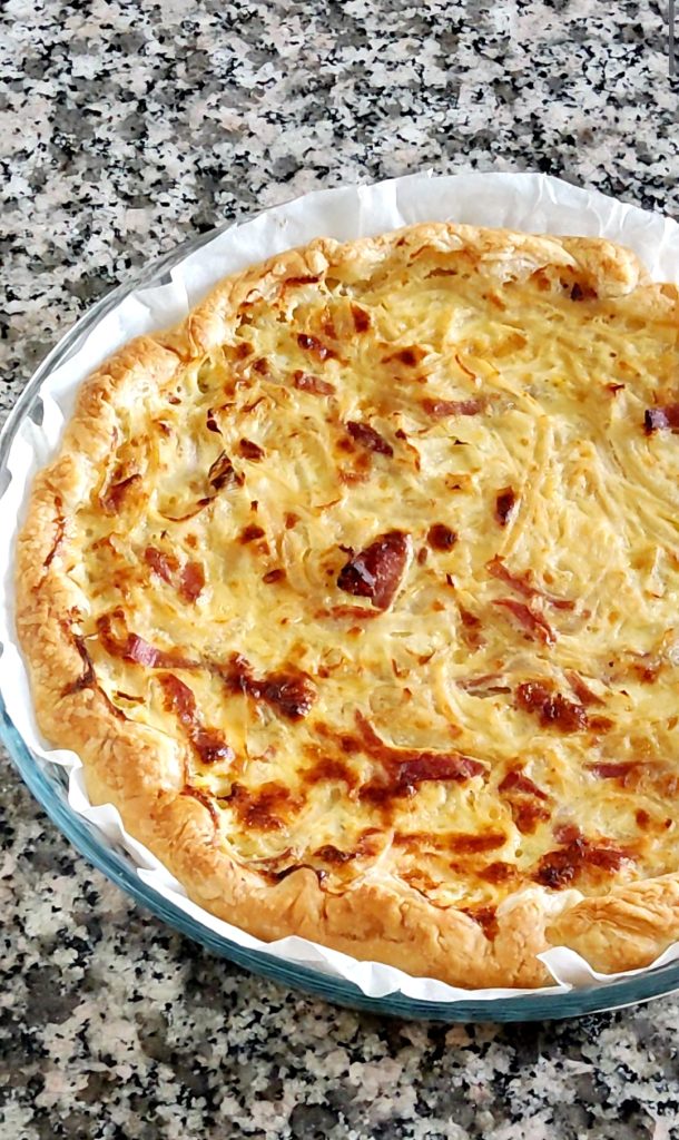 Tarta salada con cebollas y speck, deliciosa y sabrosa. Las tartas saladas siempre resuelven en pocos minutos un almuerzo, una cena o la llegada imprevista de invitados. Basta con tener un rollo de masa de hojaldre o de masa quebrada en la nevera y luego con otros ingredientes siempre diferentes se puede preparar algo delicioso que conquista siempre a todos en la mesa. Justo como la receta que quiero contaros hoy. Un relleno de huevos, speck y cebollas rico y sabroso para una tarta salada muy sencilla de preparar. Yo he elegido las cebollas blancas que al cocinarse quedan más tiernas y las he cocinado simplemente en la sartén por pocos minutos. El resultado es el de una Tarta salada con cebollas súper sabrosa y deliciosa que en mi casa ha gustado muchísimo. Os recomiendo no perder también la receta de las Cebollas al horno con queso y la receta de mis Cebollas rellenas. Vamos entonces a la cocina y preparemos juntos una irresistible Tarta salada de cebollas
