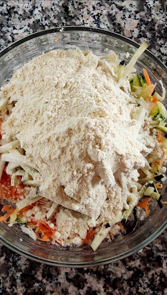 Corta la berenjena primero en rodajas finas y luego en tiras finas. Añade también la berenjena en el bol con las otras verduras. Añade una pizca de sal y la harina de garbanzo.