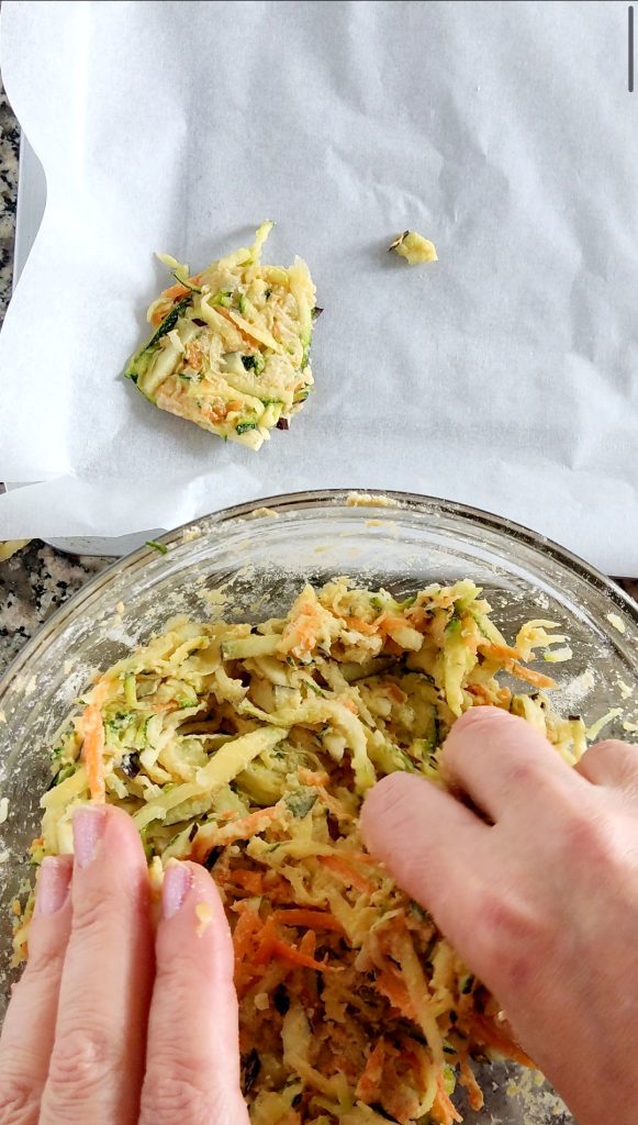 Mezcla bien para amalgamar todos los ingredientes, primero con un tenedor y luego mezcla con las manos, de esta manera el agua liberada por las verduras actuará como un aglutinante para preparar luego las tortitas.