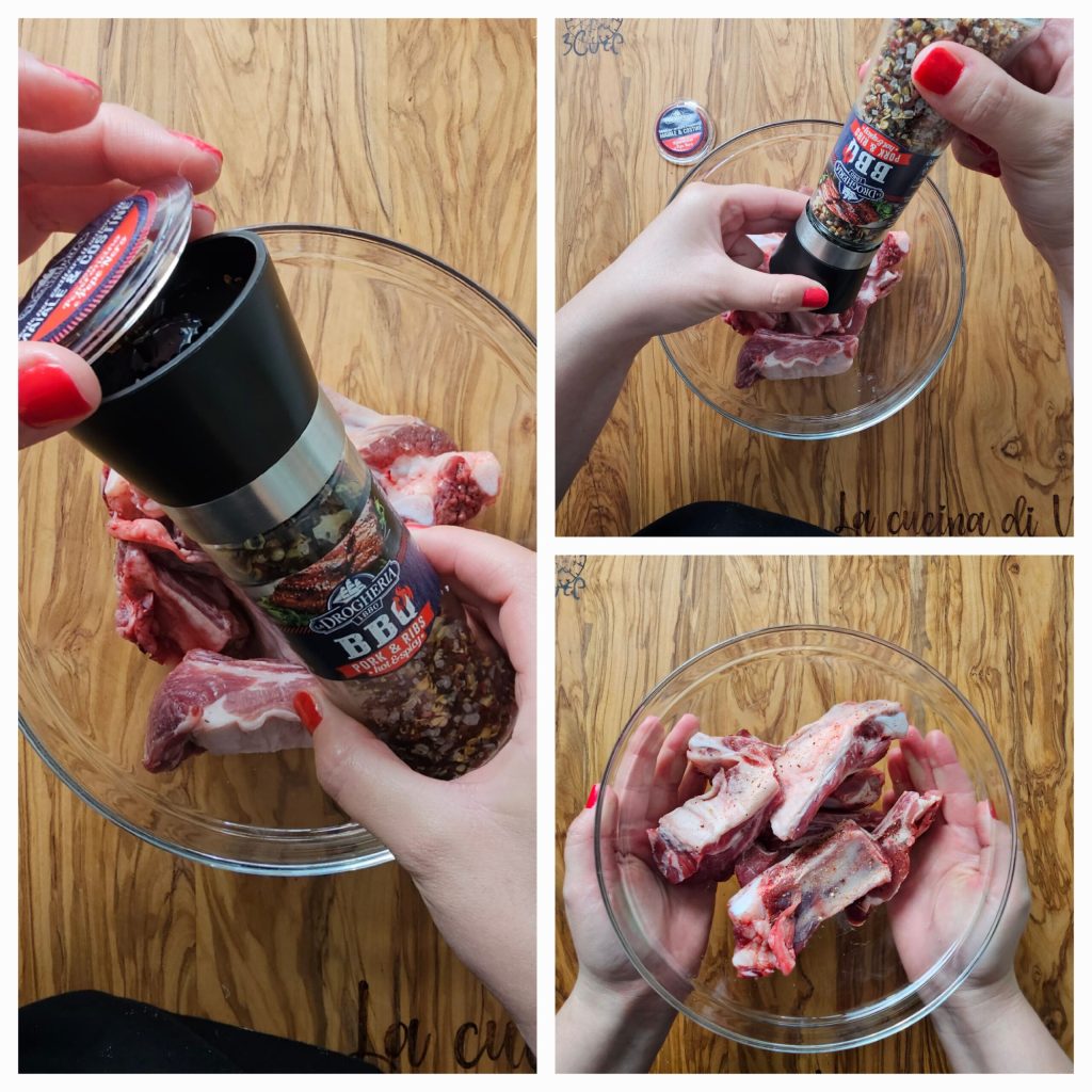 Para preparar esta deliciosa receta con costillas de cerdo, comienza sazonándolas con la mezcla de hierbas y especias BBQ PORK & RIBS LA DROGHERIA 1880. Coloca las costillas en un bol con 5-6 vueltas del molinillo de BBQ PORK & RIBS LA DROGHERIA 1880, luego mezcla y deja reposar durante media hora.