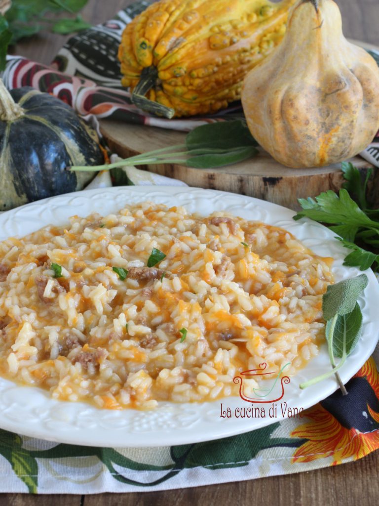 Esta vez he combinado la calabaza con salchicha, que realmente queda bien, equilibra muy bien los sabores en el plato y añade un toque más sabroso al risotto y luego digámoslo, ¡calabaza y salchicha juntos quedan genial! También he añadido un poco de salvia fresca, ¡queda de maravilla!