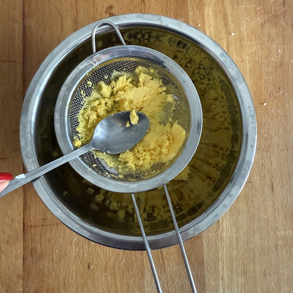 Tamiza las yemas cocidas con un tamiz, ayudándote con el dorso de una cuchara.
