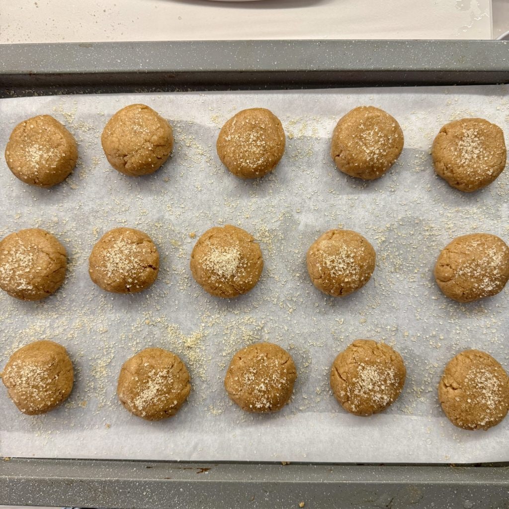 Prepara una bandeja cubierta con papel para horno. Forma bolitas de aproximadamente 25 g, aplánalas ligeramente, colócalas en la bandeja y espolvoréalas con un poco de azúcar moreno.