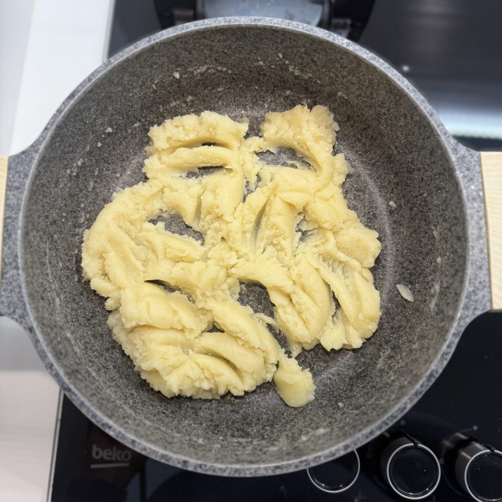 Debes alcanzar la consistencia que ves en la foto: si levantas la espátula, la pasta choux debe quedar adherida sin deslizarse rápidamente en la cacerola.