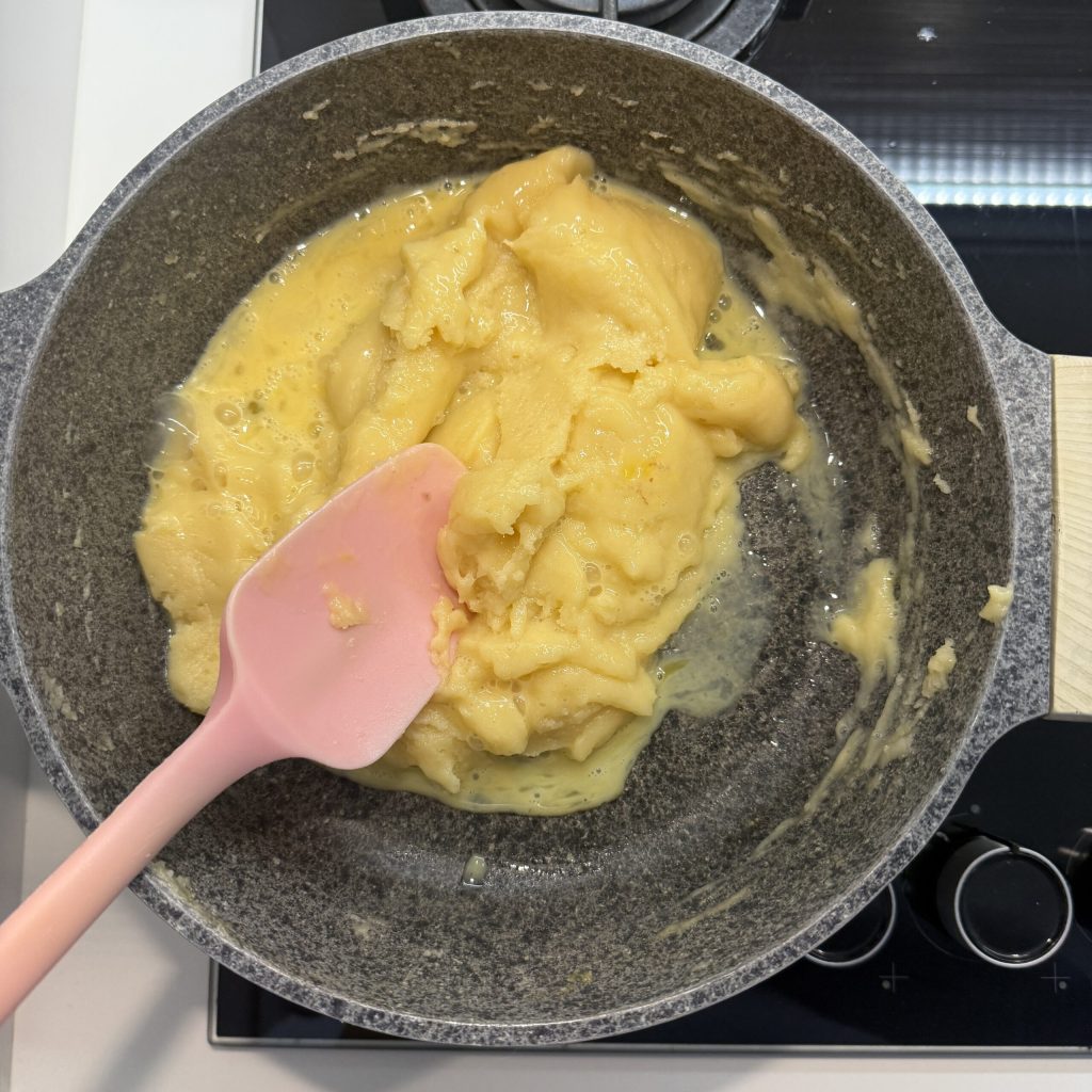 2. Añade los huevos cuando la masa esté tibia: los huevos deben añadirse uno a uno cuando la masa no está ni demasiado caliente (los huevos podrían «cocerse» antes de tiempo), ni completamente fría (porque podríais tener dificultades para incorporar los huevos a la mezcla).