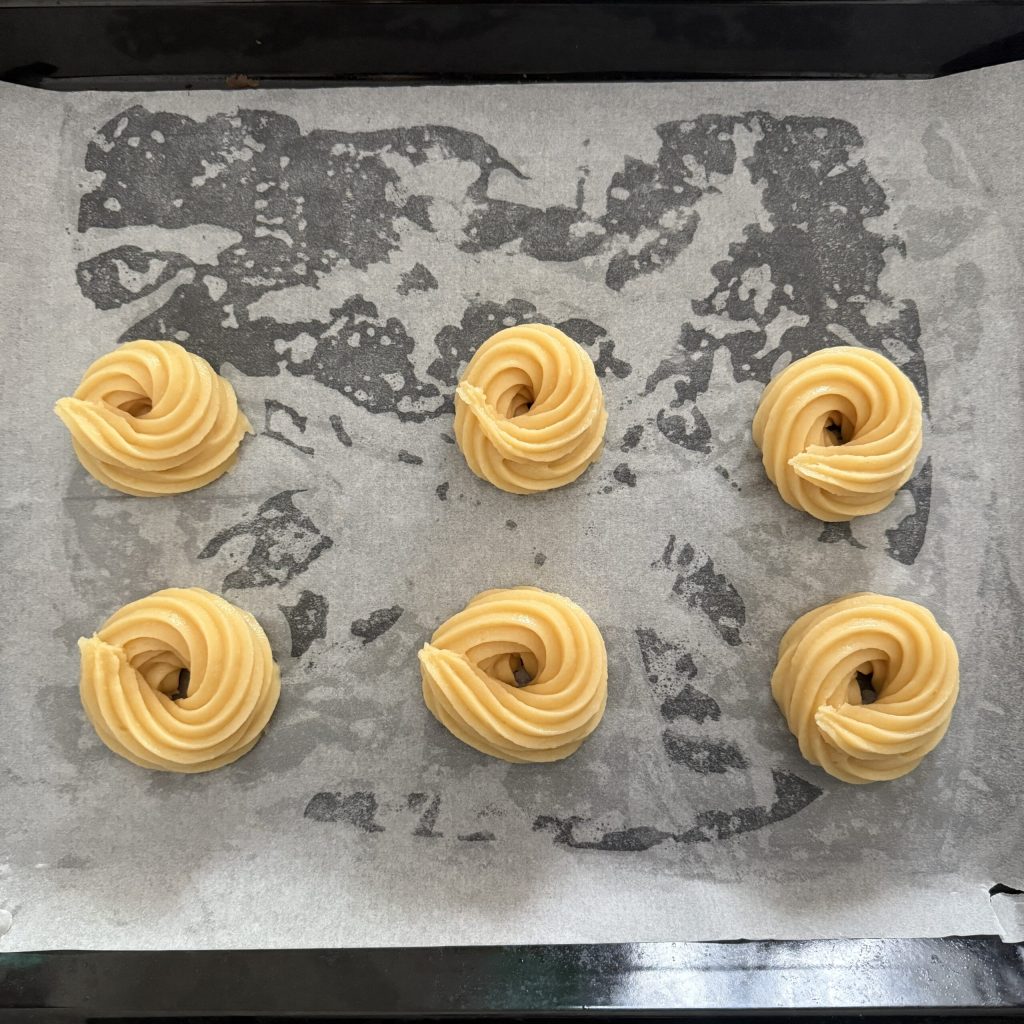 Una vez lista, prepara una manga pastelera con una boquilla grande de estrella y rellénala con la pasta choux.Precalienta el horno a 190° ventilado y mientras tanto toma una bandeja de horno, ponle un poco de aceite y coloca encima una hoja de papel de horno. De esta manera la hoja no se moverá.
