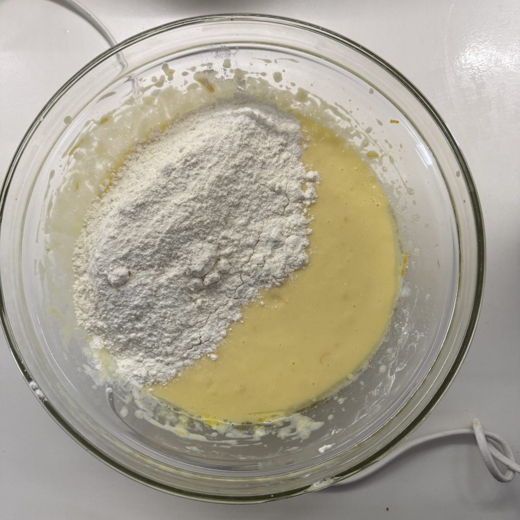 Ahora añadid la harina tamizada y la levadura. Batid nuevamente con las batidoras eléctricas lo necesario para obtener una masa homogénea.