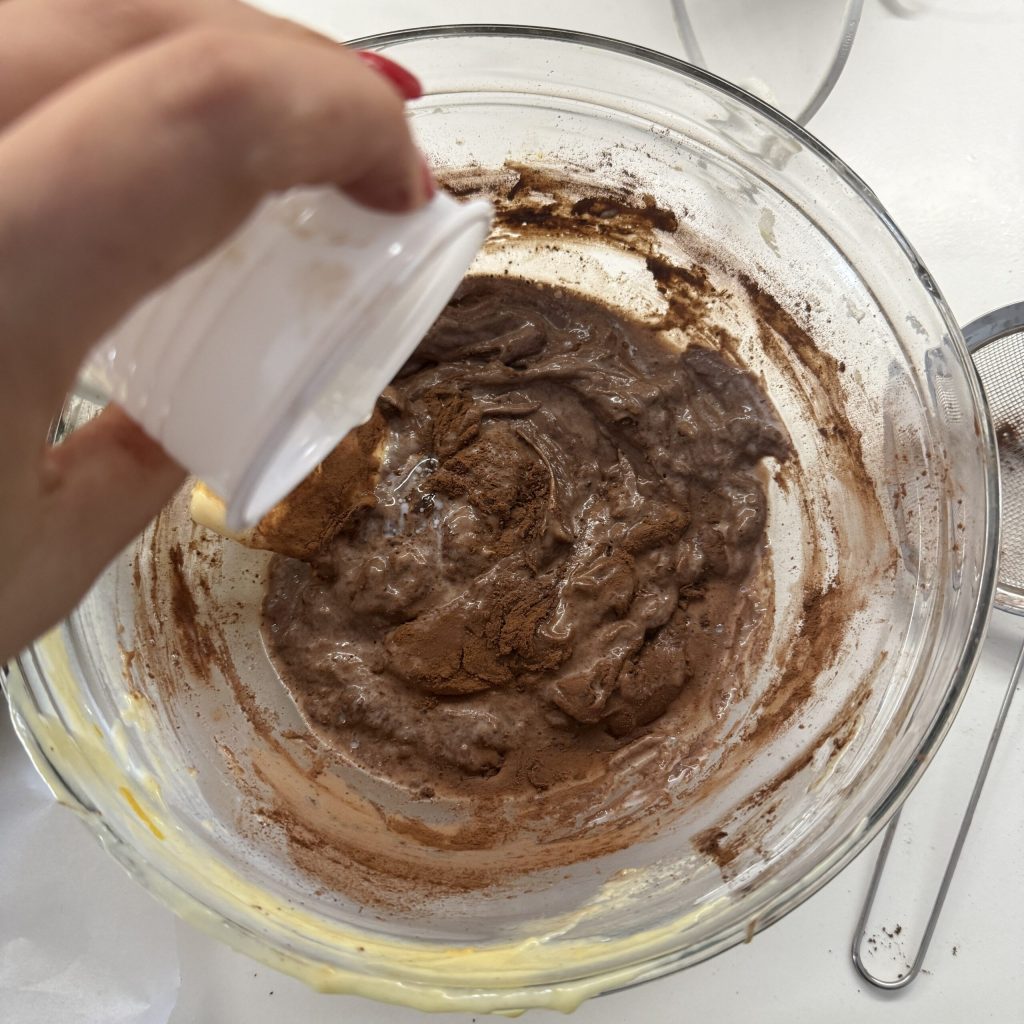 Al resto de la mezcla en el bol, añadid el cacao amargo tamizado.