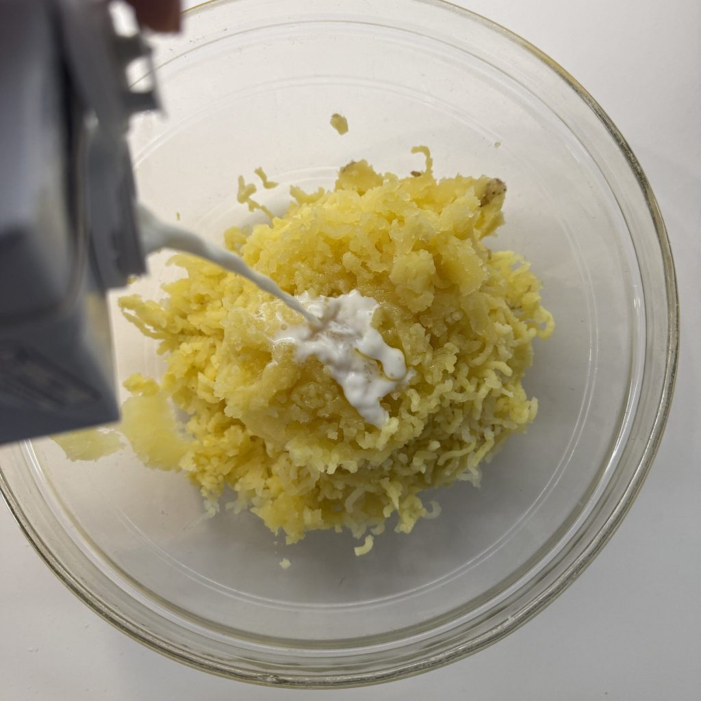 Añadan también un poco de leche. Les recomiendo no añadirla toda desde el principio: de este modo, una vez amasado el compuesto, podrán ajustar la consistencia. Si les gusta más suave, añadan más leche (siempre poco a poco) hasta alcanzar una consistencia cremosa (como un puré, por así decirlo); si, en cambio, les gusta una pizza de patatas más compacta, no añadan más leche.