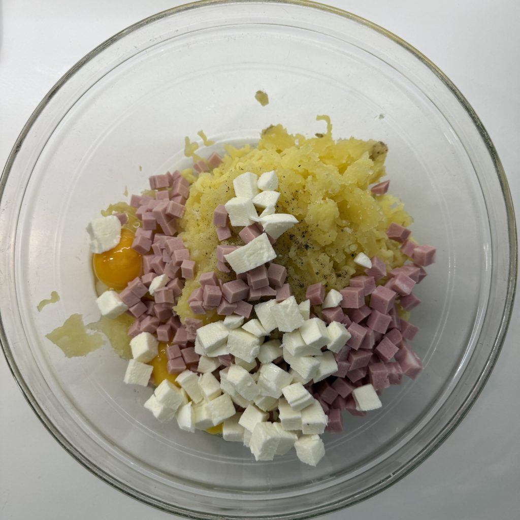 Salen y pimenten el compuesto, añadan la mortadela en daditos (o el jamón cocido o también pueden poner mitad mortadela y mitad jamón cocido), la mozzarella, el queso de pasta hilada en trocitos y los huevos.