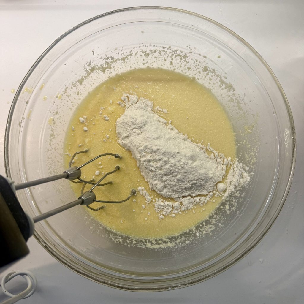 Agrega el queso rallado, la harina y la levadura tamizada: 1 min. vel 4.